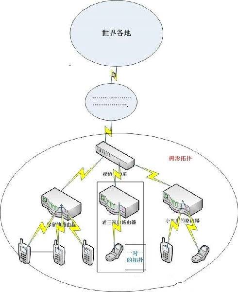 比如你的一臺手機連接上了你家的路由器,此時手機和路由器之間產(chǎn)生了數(shù)據(jù)傳輸,這就是組網(wǎng)。然后你家的路由器通過“貓”和光纖,連接到交換機,這也 是組網(wǎng)。將手機、路由器、交換機看作一個整體,他們之間就產(chǎn)生了一個樹形組網(wǎng)方式。根據(jù)設(shè)備節(jié)點之間的通訊關(guān)系,就會形成各種形狀的拓撲圖。具體看圖一。