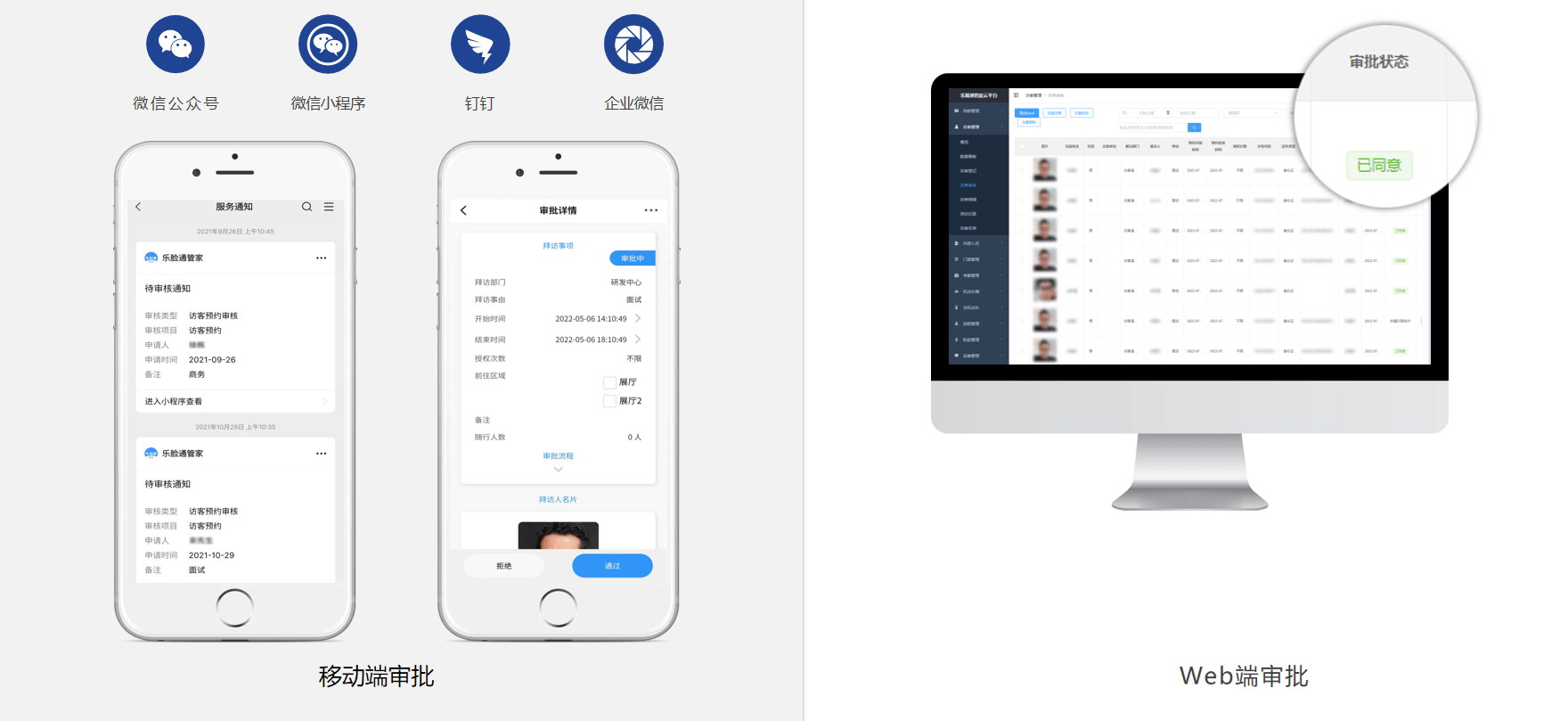 管理員可通過微信、H5移動(dòng)端、Web端設(shè)置外來人員的通行權(quán)限,訪客審批后,相關(guān)權(quán)限自動(dòng)下發(fā)到聯(lián)動(dòng)的門禁控制器上,支持通行權(quán)限的修改,同時(shí)支持添加黑白人員名單。