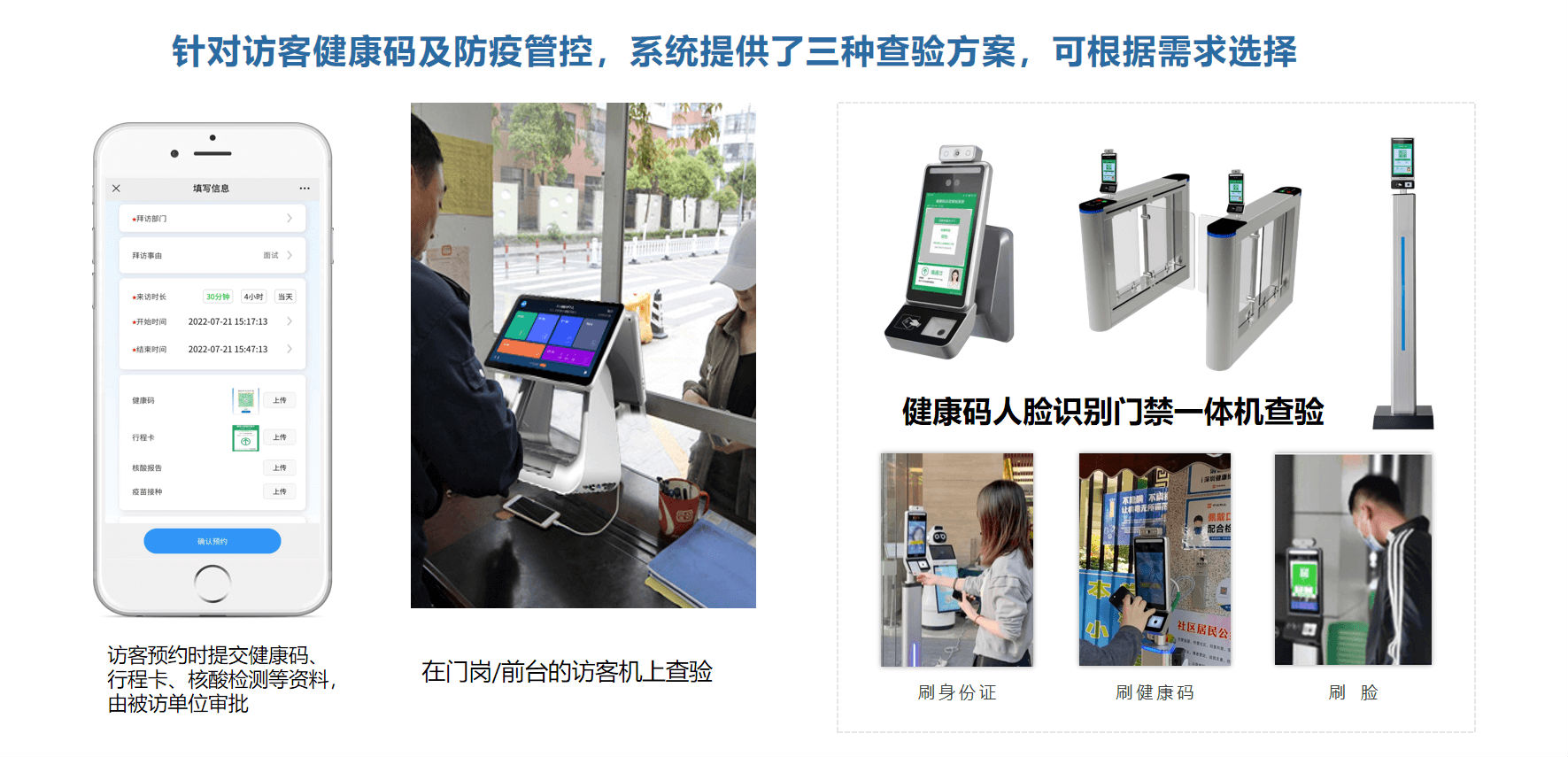 未提前預(yù)約登記的訪客來訪,訪客可通過現(xiàn)場的訪客一體機(jī)進(jìn)行登記,訪客一體機(jī)支持身份證件快速登記,同時(shí)支持人證比對(duì)、體溫測量、健康碼狀態(tài)核驗(yàn)等功能,信息提交由被訪人審批通過后,可打印訪客單掃碼或刷臉通行。
